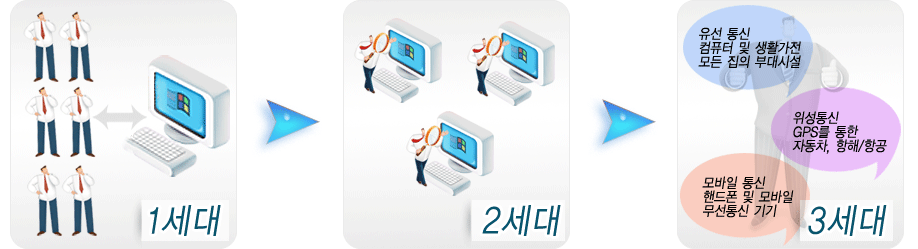 | Computing의 발전사를 보면 한대의 컴퓨터에 다수의 인원이 접속하는 1세대 형태에서 소프트웨어 및 하드웨어의 발전을 통해 1인 1컴퓨터의 제 2세대의 형태로 변화하게 됐으며, 생활가전 및 휴대용기기의 발전으로 유무선 통신 및 위성통신이 가능한 제 3세대로 접어들고 있습니다. 제 3세대는 한명의 개인에 다수의 컴퓨터가 접속되는 시기로 유비쿼터스가 일상 생활에 접목된 형태라할 수 있습니다. |