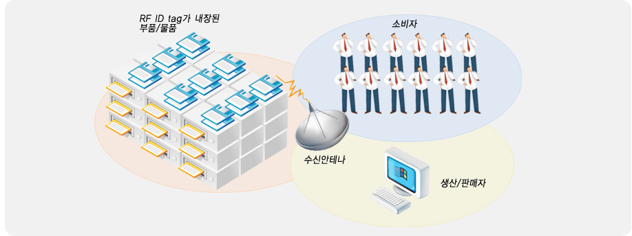 | RF ID tag를 이용해 판매수량 및 구매자 정보, 상품 및 부품의 위치 / 이동경로 등을 실시간으로 파악할 수 있으므로 부품 및 물품의 재고량 및 생산량을 조절하기 용이하며 부품 및 물품의 생산에서 폐기까지의 전반적인 경로를 확인할 수있는 장점이 있습니다. |