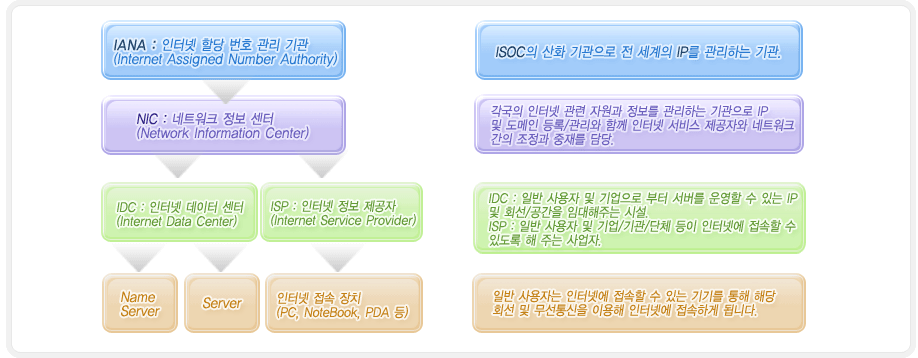 | IP 할당은 인터넷 할당 번호 관리 기관(IANA)에서 각국에 할당하게 되며, 네트워크 정보 센터(NIC)는 할당 받은 IP 대역을 이용해 자국의 인터넷 데이터 센터(IDC) 및 인터넷 정보 제공자(ISP)에게 IP를 할당하게 됩니다. 일반 사용자 및 기업/기관/단체는 인터넷 데이터 센터(IDC) 및 인터넷 정보 제공자(ISP)를 통해 IP를 부여 받아 인터넷에 접속하거나 직접 서버 및 네임서버를 구축해 운영할 수 있습니다. |