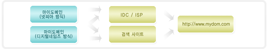 | (2) 도메인(Domain) : 도메인 등록 대행사를 통해 등록 및 관리가 이루지며, 등록한 후 도메인을 이용해 서버호스팅, 웹호스팅, 파킹/포워딩, 이메일 등의 다양한 서비스를 이용할 수 있습니다. 네임서버에 세팅됨으로서 해당 서버의 IP와 연결되어 접속되어 집니다. |