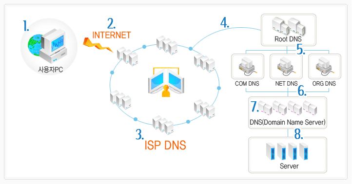 그러므로 도메인 이름을 이용해 인터넷에 접속하기 위해서는 네임서버가 설정되어 있어야 하며, 네임서버에서 연결해주는