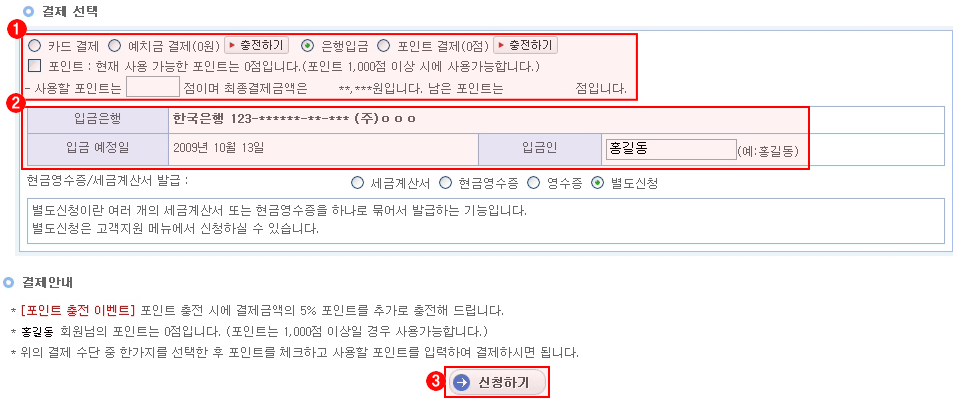 결제선택 : 서비스 신청에 대한 결제방법을 선택하는 필드입니다. 카드결제/은행입금/예치금의 결제 수단을 선택하실 수 있습니다. |