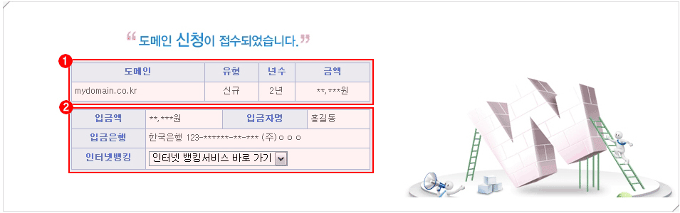 | (2) 은행입금정보 : 도메인 신청에 대한 입금정보가 확인이 가능합니다. |