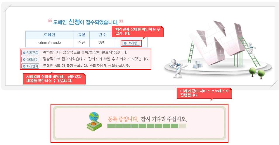 신용카드 및 예치금 결제가 완료되면 아래와 같이 서비스 처리중이라는 페이지로 접속됩니다. 처리 결과가 처리완료로 변경될 때까 지 기다려 주시기 바랍니다. |