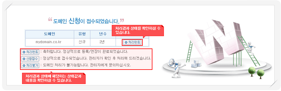 도메인 등록이 완료된 상태입니다. 내도메인 또는 내정보의 도메인 목록에서 등록된 도메인을 확인하실 수 있으며, 도메인정 보조회를 통해 등록된 도메인 정보를 확인하실 수 있습니다. |