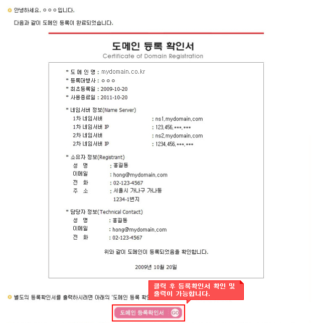도메인 등록 확인서 : 도메인 등록완료 메일의 도메인 등록확인서 버튼을 클릭하시면 아래와 같은 도메인 등록확인서를 확인하실 수 있으며 인쇄하기를 클릭해 출력하실 수 있습니다. |