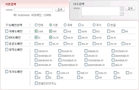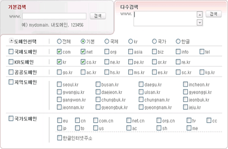 : 한글/영문 도메인 검색 시 COM/NET/KR 도메인을 위주로 검색하 는 기능입니다. |