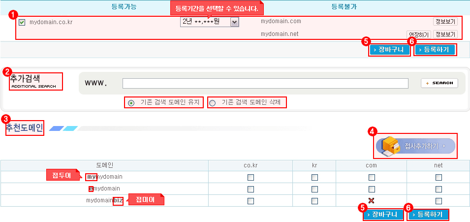 | (5) 장바구니 : 검색된 도메인을 장바구니에 담는 기능입니다. 장바구니에 담은 후 다른 서비스를 이용하실 수 있습니다. |