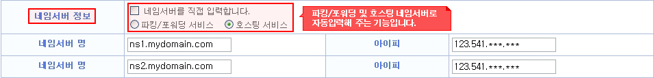 * 도메인의 네임서버를 설정할 수 있는 필드 입니다. 파킹/포워딩 네임서버 및 호스팅 네임서버로 설정이 가능합니다.