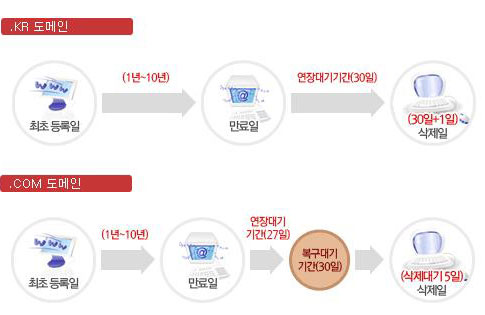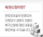 도메인의 연장유효일자를 넘기게 되면 기간연장을 할 수 없으므로, 만료 전에 연장을 신청해 주시기 바랍니다. |