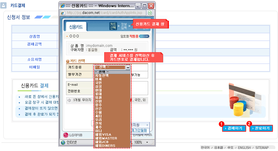 : 신청서의 결제선택에서 신용카드 결제를 선택했다면 다음과 같은 페이지로 접속하게 됩니다. |