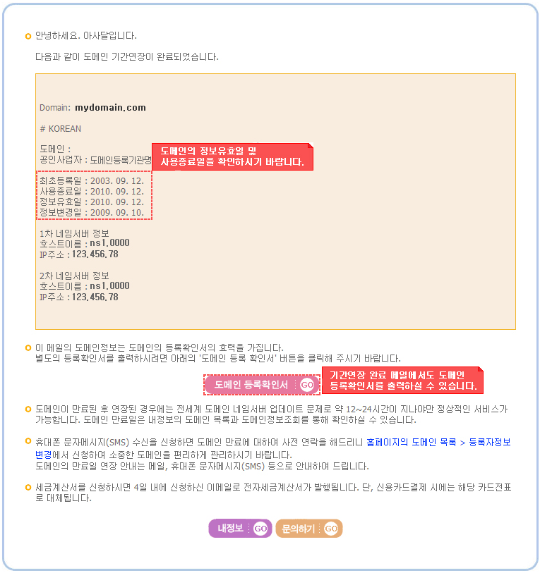| - 기간연장이 완료되면 도메인의 소유자 이메일로 아래와 같은 연장완료 메일이 발송됩니다. |