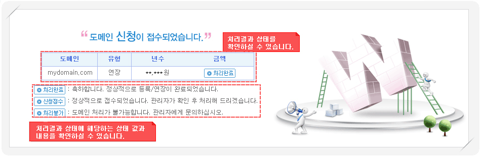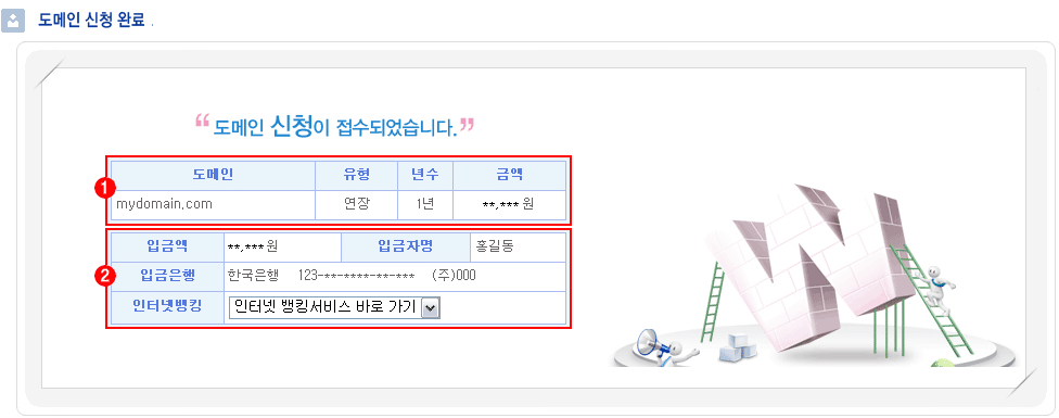 은행입금 접수완료 : 은행입금으로 신청했을 경우 아래와 같은 완료 페이지로 접속이 이루어지며 도메인의 소유자 이메일로 도메인 신청접수 메일이 발송됩니다. |