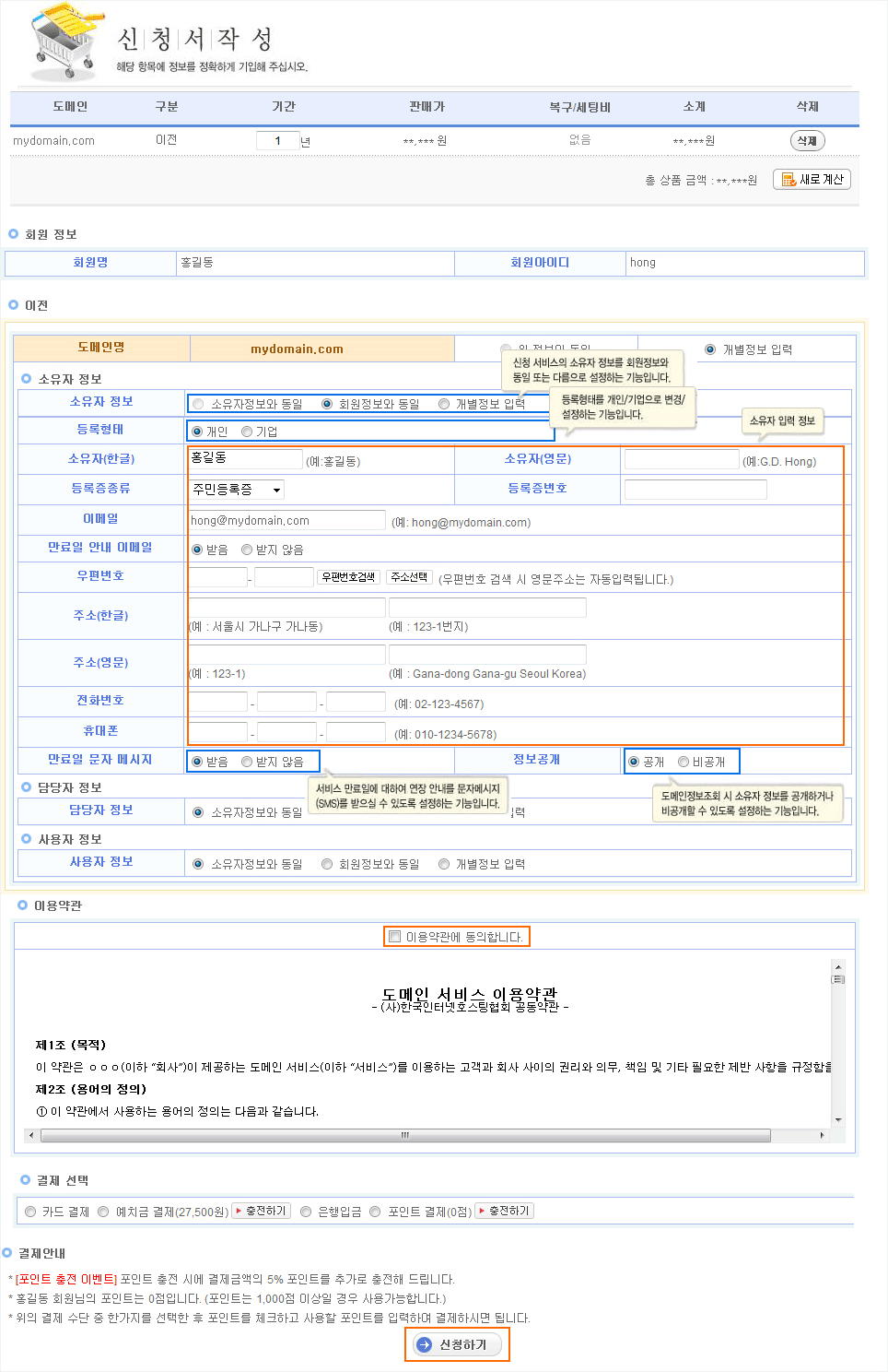 | 등록자 인증이 끝나면 이전 신청서를 작성하게 됩니다. 이전 신청서 정보를 정확히 기입한 후 결제수단을 선택하여