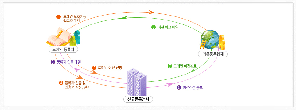 | 도메인 등록자는 옮겨가고자 하는 등록업체(Gaining Registrar)에 도메인 이전을 신청합니다. |