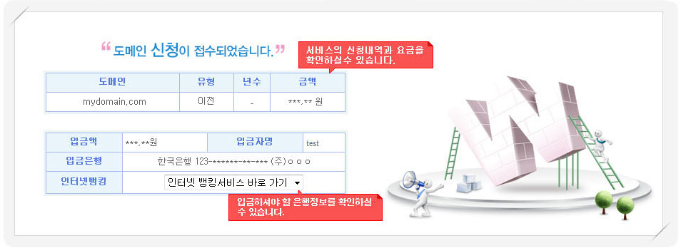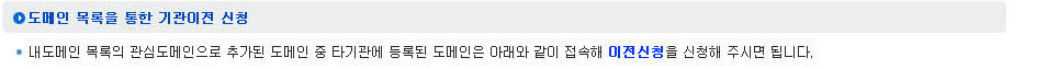 | (1) 은행입금 접수완료 : 은행입금으로 신청했을 경우 아래와 같은 완료 페이지로 접속이 이루어지며 소유자 이메일로 기관이전 신청접수 메일이 발송됩니다. |