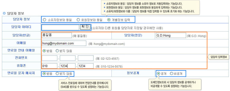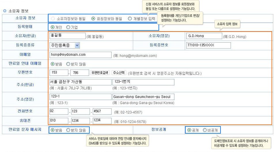 정보를 입력하는 필드입니다. 소유자 정보는 해당 서비스에 대한 소유권을 행사할 수 있는 소유자의 정보를 입력하는 필드이므로 정확히 입력하셔야 합니다. |