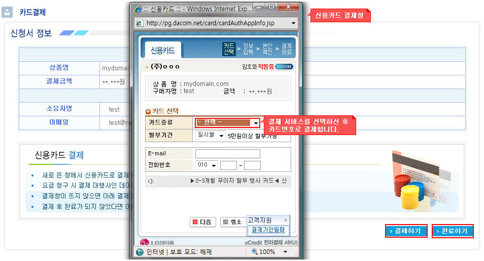 | (2) 신용카드 결제 : 신청서의 결제선택에서 신용카드 결제를 선택했다면 다음과 같은 페이지로 접속하게 됩니다. |
